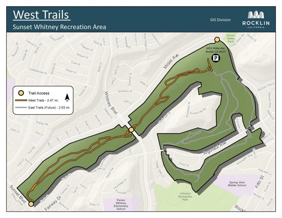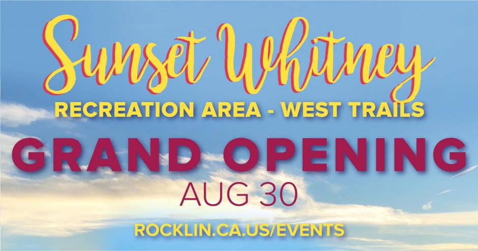 The City of Rocklin invites the community to celebrate the opening of the West Trails at the Sunset Whitney Recreation Area on Friday, August 30, at 6 p.m. at 4201 Midas Ave.