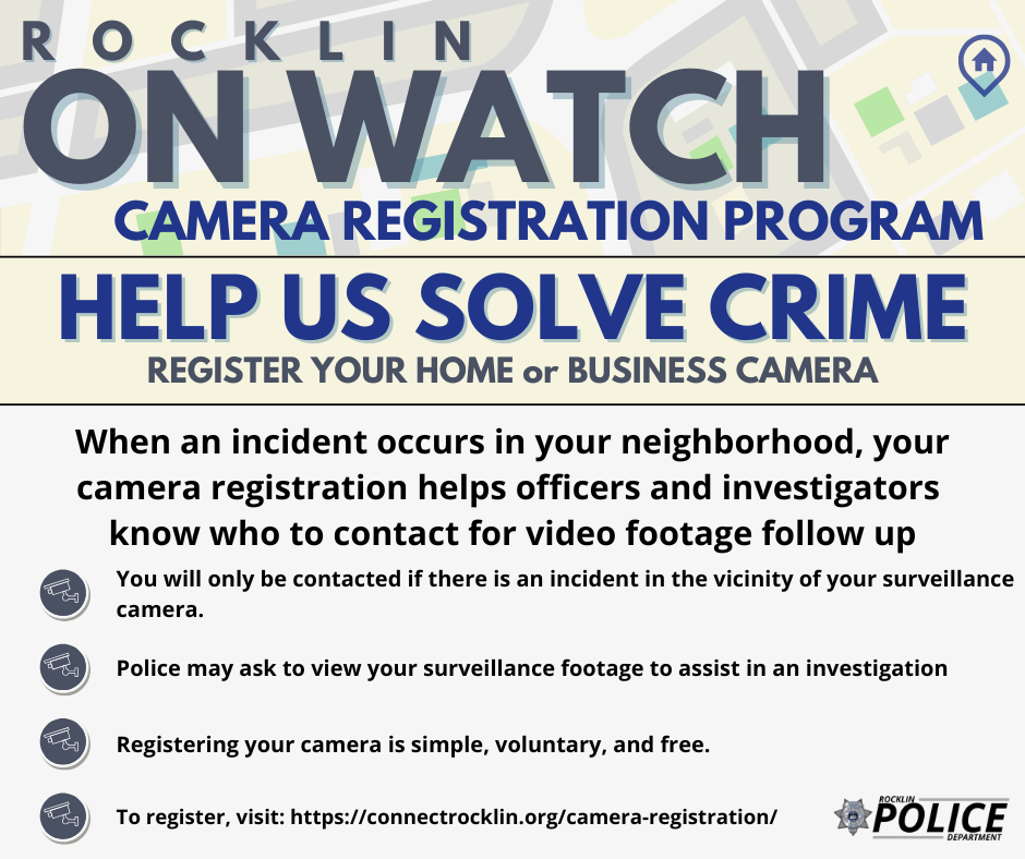 Camera registration is the Rocklin Police Department’s newest crime prevention and investigation tool. It allows the community to join our crime fighting team to keep residents and businesses in the City safe. Rocklin on Watch allows residents and business owners to register the locations of their video surveillance camera systems with the Rocklin Police Department. When a crime or incident occurs, the Police Department can easily identify cameras in the area and enlist the help of the community to help us collect video evidence and potentially solve the crime. The registration information provided will be used for official purposes only and will not be shared.